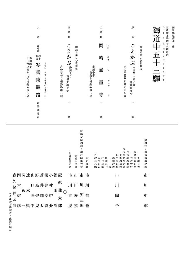 京都を起点に江戸を目指しながら、五十三次の宿場で物語が展開され、早替りで演じる道中の人々が魅力の本作。今回は、京都三条大橋より三十九番目の宿場にあたる池鯉鮒まで、そして掛川より箱根大滝までを「こえかぶ」が担います。第一線で活躍する人気声優が、声の技術を駆使して巧みに複数役演じ分ける「声の歌舞伎」にご期待ください。