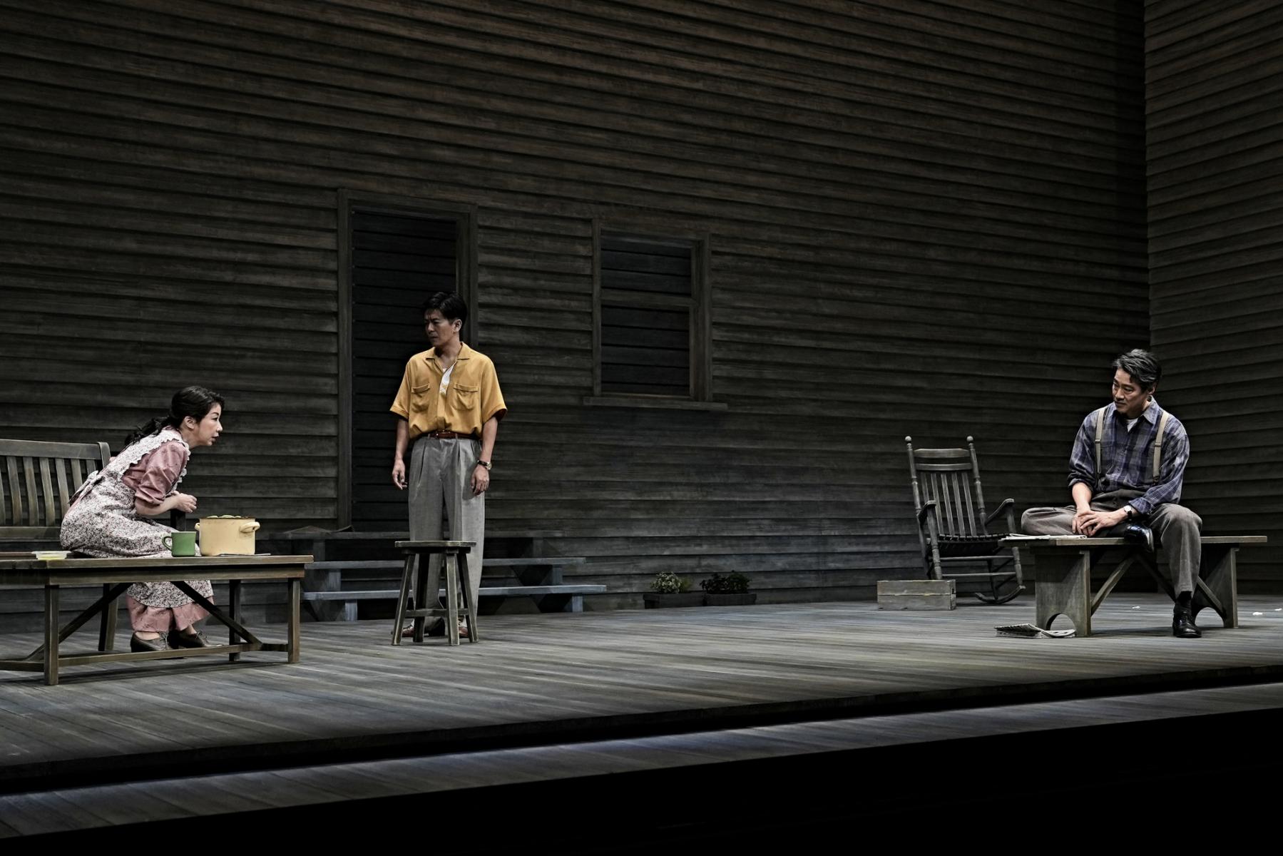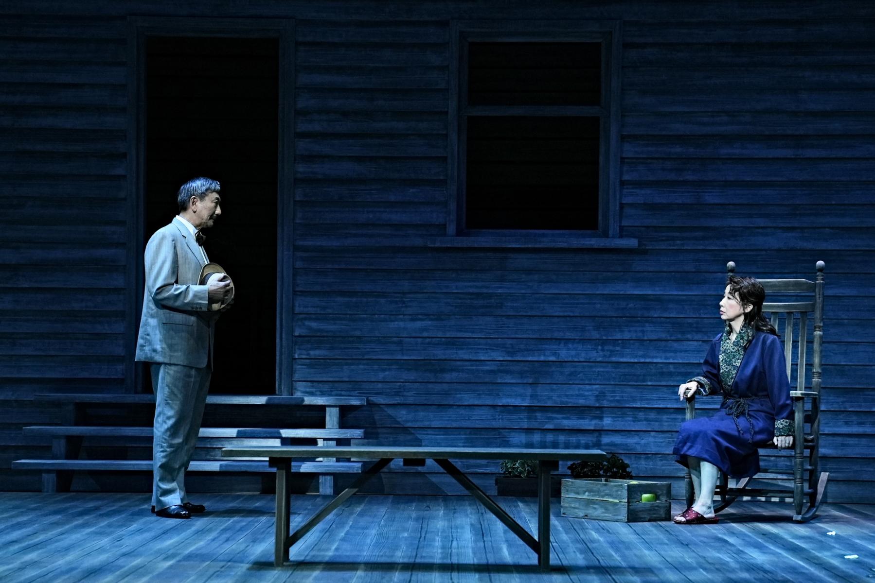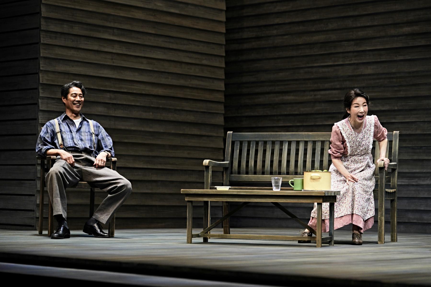 そうしたケラー家とディーヴァー家の相克を、一歩外から包み込むように受け止めるのが、山崎一扮する隣人の医師ジムだ。栗田桃子演じる妻スーとのやり取りは小さな地雷を抱えた夫婦漫才のようでもあるが、「生きる」ことの諦念を知るジムの存在が、どれだけケラー家の心の拠り所となっていることか。ジムがケイトに語りかける滋味に溢れた言葉は、殺伐とした会話も多いこの芝居の中でしみじみと胸に沁みわたる。