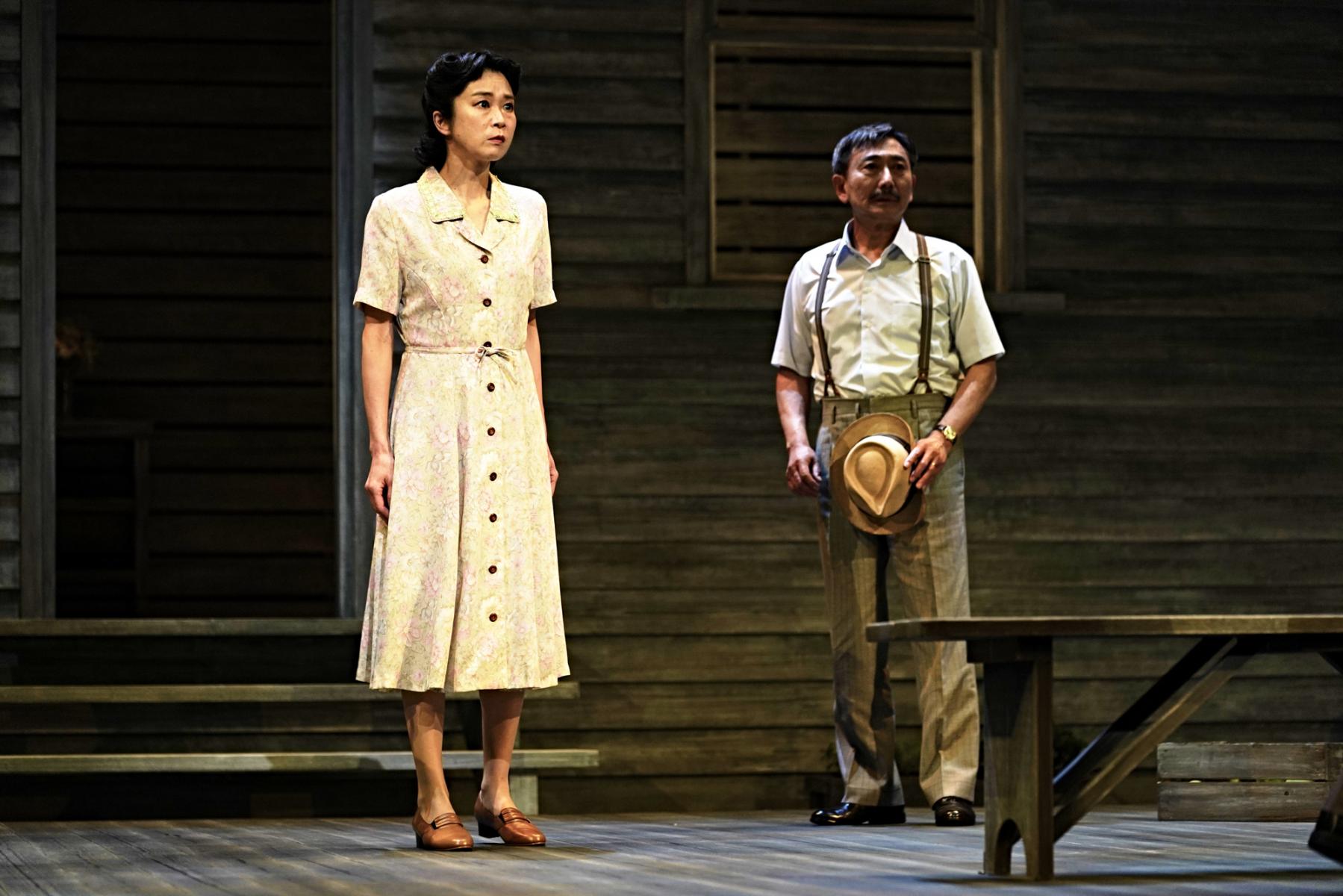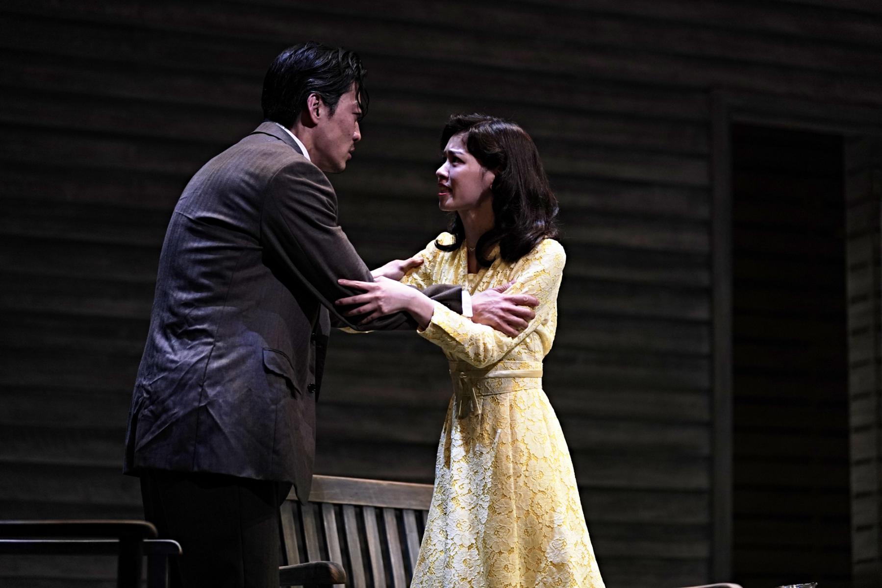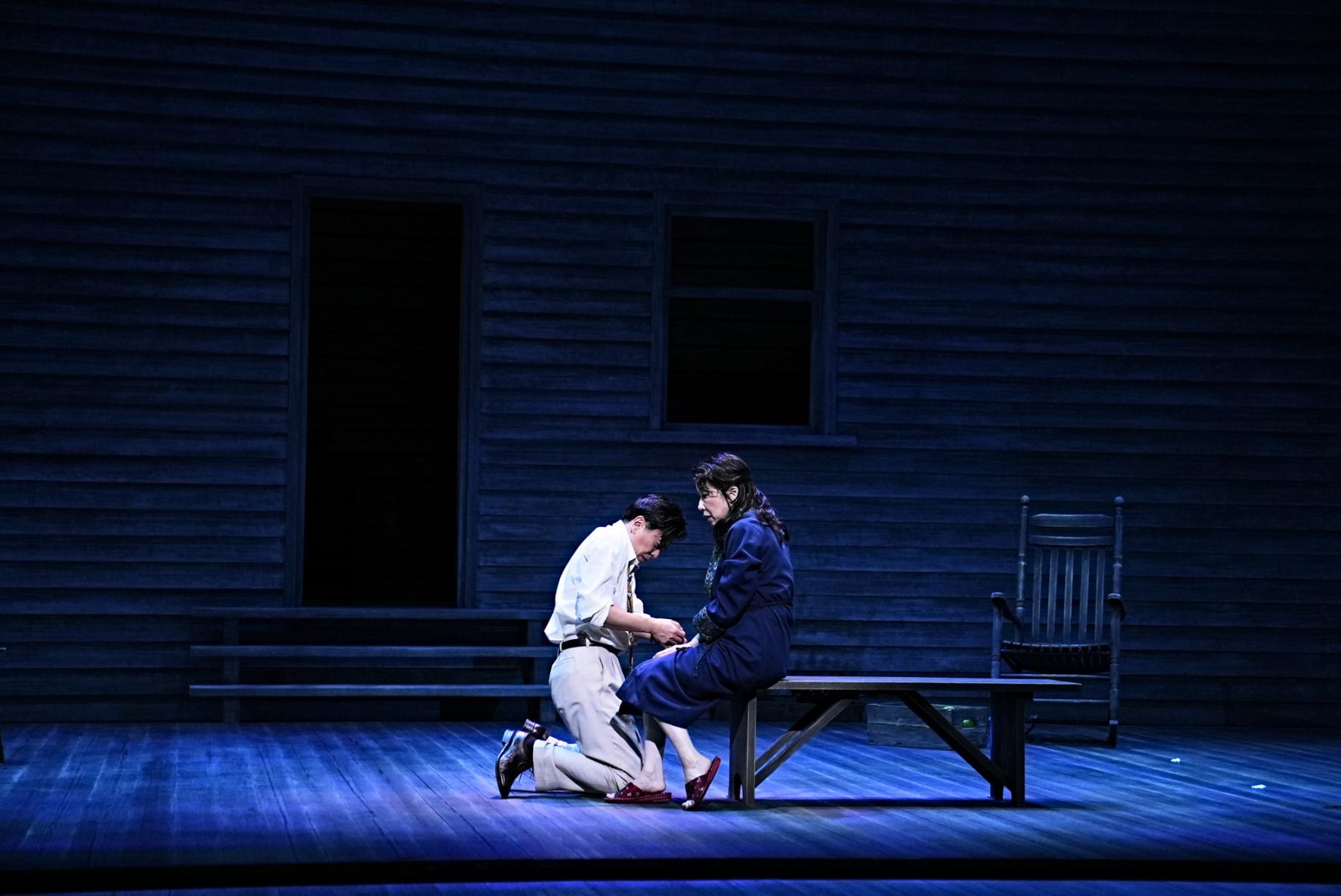 そうしたケラー家とディーヴァー家の相克を、一歩外から包み込むように受け止めるのが、山崎一扮する隣人の医師ジムだ。栗田桃子演じる妻スーとのやり取りは小さな地雷を抱えた夫婦漫才のようでもあるが、「生きる」ことの諦念を知るジムの存在が、どれだけケラー家の心の拠り所となっていることか。ジムがケイトに語りかける滋味に溢れた言葉は、殺伐とした会話も多いこの芝居の中でしみじみと胸に沁みわたる。