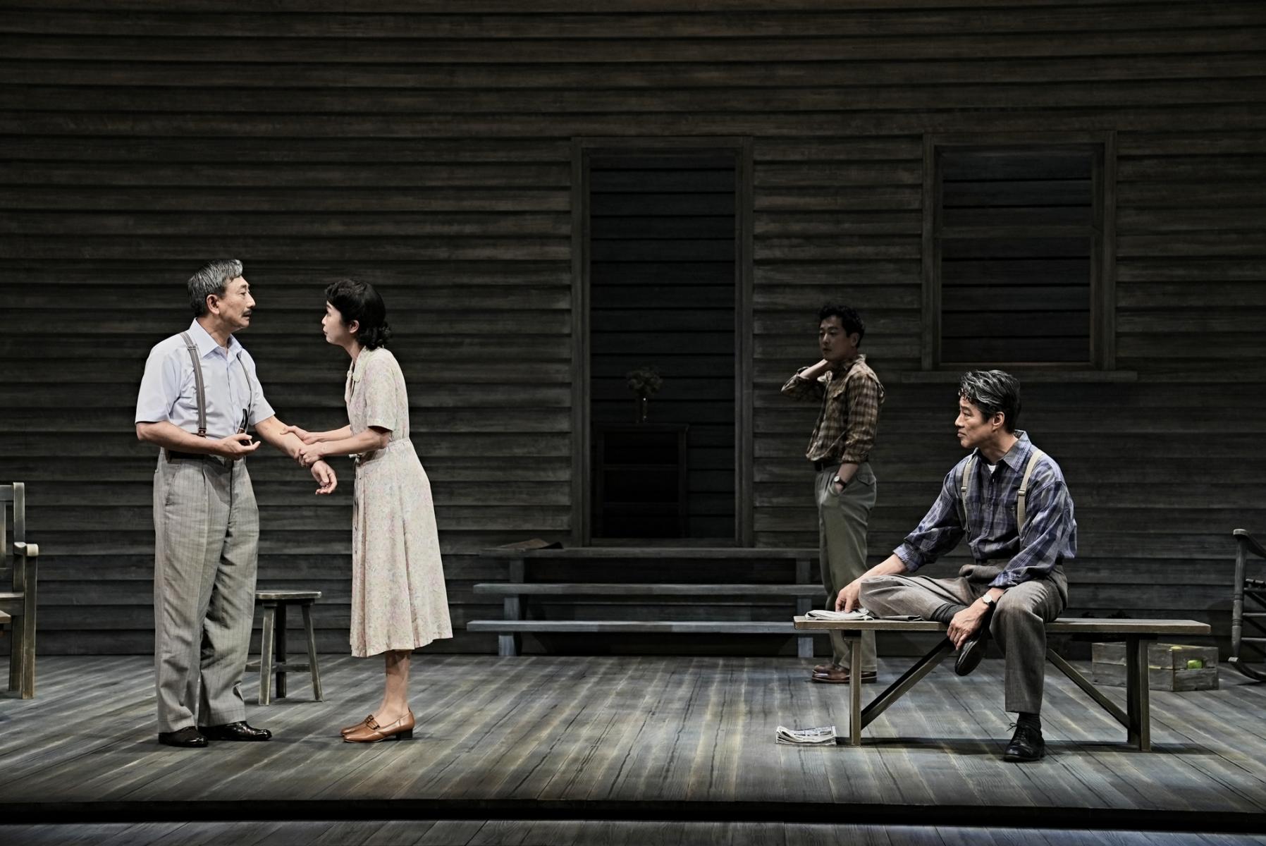 舞台となるのは、ジョーの心象風景を表すかのように高くそびえ立ち、他人を拒絶する壁に囲まれたケラー家の「裏庭」のみ。3幕(休憩は1回)を通じて一切のセット転換もないこの裏庭で繰り広げられる言葉の応酬と感情のぶつかり合い、そして露になっていく真実が、怒濤のように押し寄せる。そこにあるのは、戯曲の言葉と俳優の演技だけだ。シンプルに徹したリンゼイ・ポズナーによる演出は、ひたすら登場人物たちの微細な心の動きにフォーカスを絞っていく。細部をゆるがせにしないことで、社会に対する個人の責任という大きな主語のテーマが、内実を伴って浮かび上がるのだ。瞬時にして変化する人物同士のパワーバランス、めまぐるしく入れ替わる情愛と疑心暗鬼、感傷をバッサリ断ち切る容赦のない事実。そうした瞬間瞬間を鮮やかに生きる俳優たちから、とにかく目が離せない。