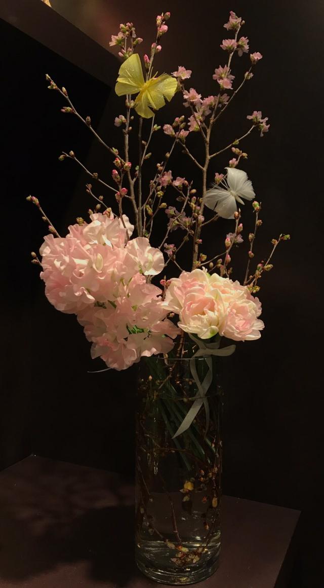 今回のレッスンでは円柱のガラスの器を使って、お水の中に桜を入れたり、チューリップのプチブーケをあしらったりし、仕上げに蝶々のオーナメントでさらに春を演出します。