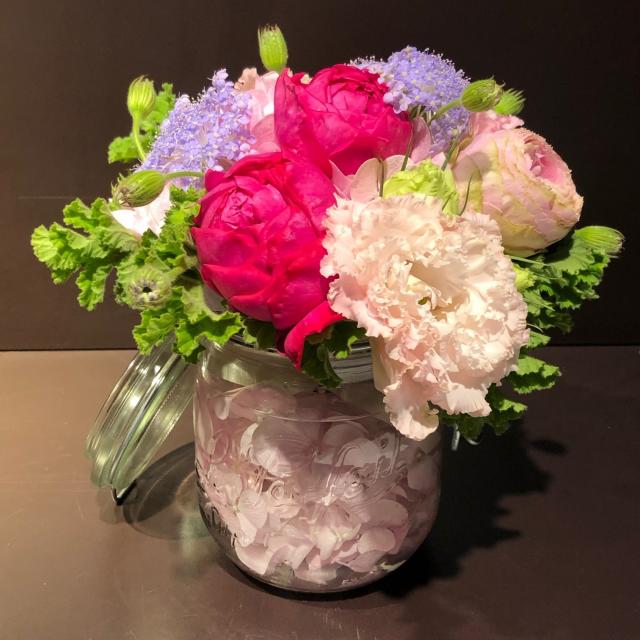 ガラス製のジャーにたっぷりとアジサイを浮かべ、バラなどを使ったミニブーケをかわいらしく活けこみます。