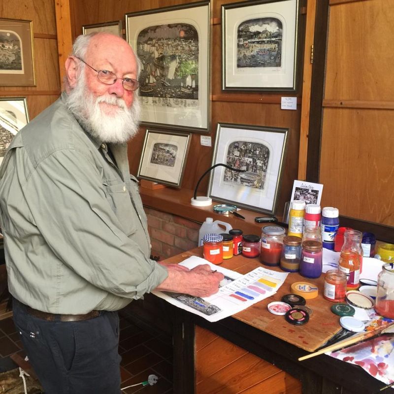 イギリス生まれ御年79歳のグラハム・クラーク。アトリエに鎮座する年代物の刷り機。彼は手彩色版画を伝統的な手法で50年以上に渡って制作し続けています。そして劇場を思わせる独特なアーチ型画面は我々に様々な物語を見せてくれます。