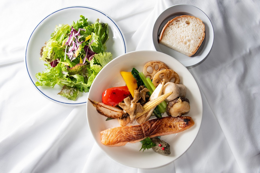 北欧料理に欠かせない食材であるサーモンをソテーし、アンチョビ、オリーブ、ケッパーなど風味豊かなタプナードで美味しさを引き立てました。お食事が進むにつれ、少しずつ登場する鳥の家族のデザインが楽しい〈イッタラ×ミナペルホネン〉のプレートと共に、秋の気配をご堪能ください。