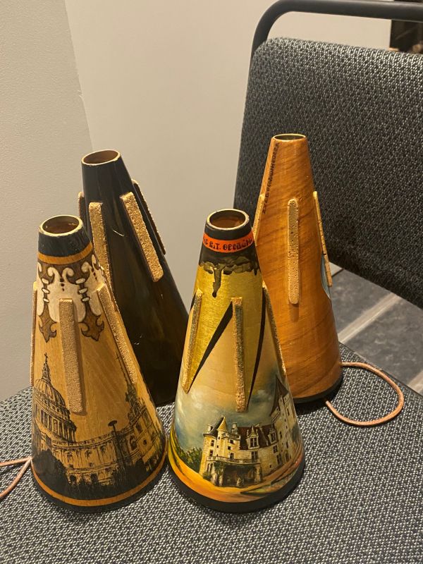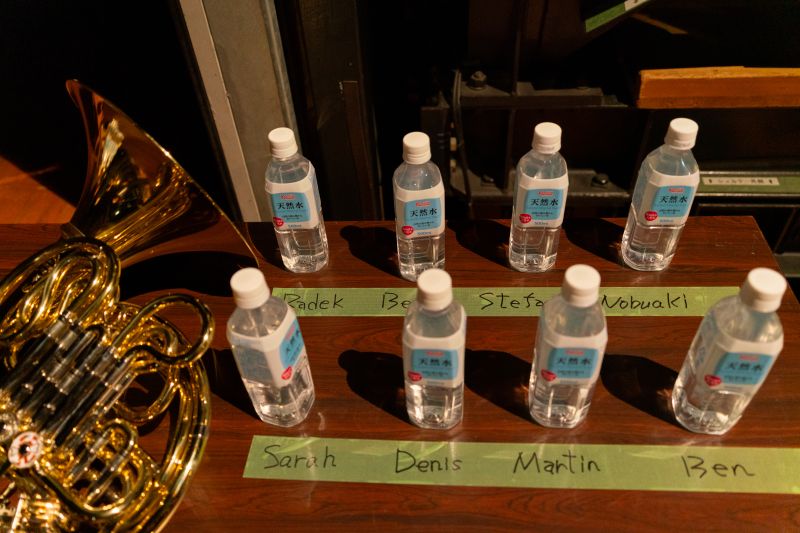 舞台裏に並べられた出演者たちの水とホルン。本番前の静かな準備時間。