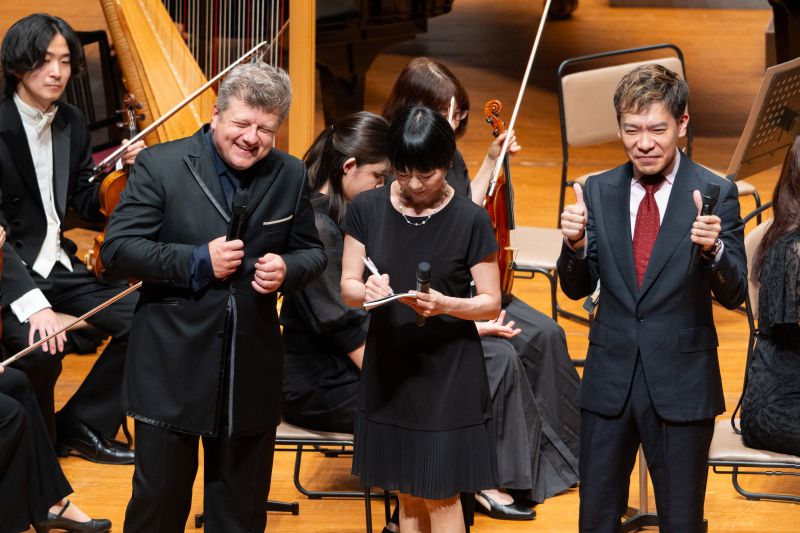 終演後の舞台袖にてコンサートマスター三浦章宏さんと