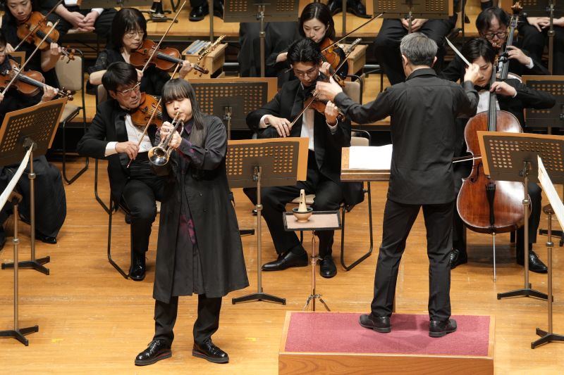 グリンカ:『ルスランとリュドミラ』序曲で軽快に始まったコンサート。続いて登場した松井が選曲したのはアルメニアの作曲家・アルチュニアンのトランペット協奏曲。多くの国際的トランペット奏者によって演奏されてきた作品ですが高い演奏技術を要する、奏者にとっては難易度の高い曲。松井は冒頭から輝かしいサウンドを繰り出し聴衆の気持ちを掴んでしまいます。“トランペットで歌うこと”を大切にしているという松井の言葉どおり、めくるめくような旋律を完璧な技巧で紡ぎだし、ホールを歌で満たしてくれました。見事なカデンツァ(トランペット・ソロ)に続く怒涛のフィナーレで鮮やかに曲を締めくくりました。