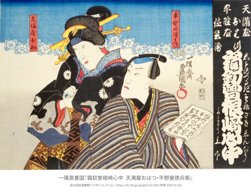 『曽根崎心中』は、1703年に大坂・竹本座で近松門左衛門が実際の心中事件をもとに人形浄瑠璃のために書き下ろした世話物です。初演は事件の1か月後に行われ大きな反響を呼び、その後、歌舞伎にも翻案されて上演されるようになりました。
