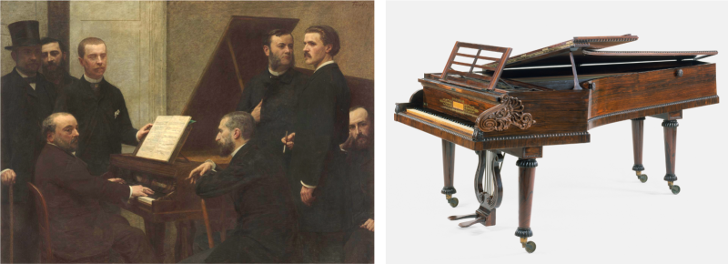 左)アンリ・ファンタン=ラトゥール《ピアノの周りで》 1885年 油彩・キャンヴァス, オルセー美術館蔵