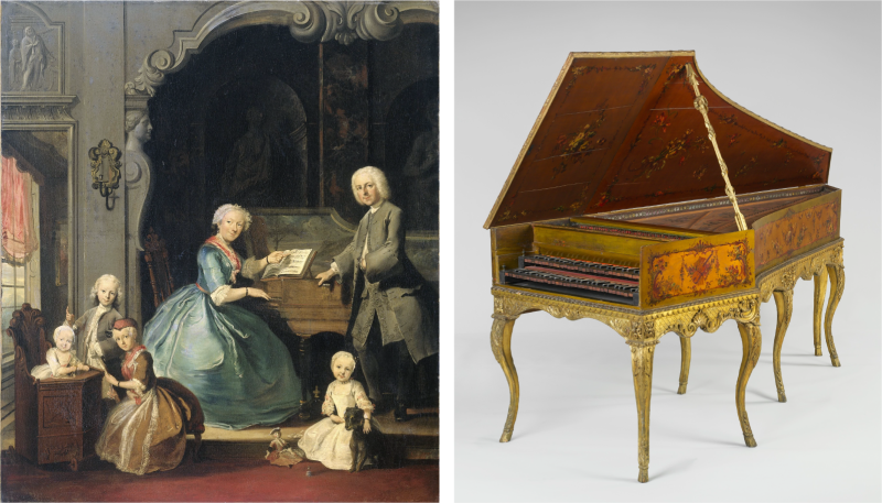 左)コルネリス・トゥルースト《ハープシコードのそばにいる家族》 1739年 油彩・キャンヴァス, アムステルダム国立美術館蔵