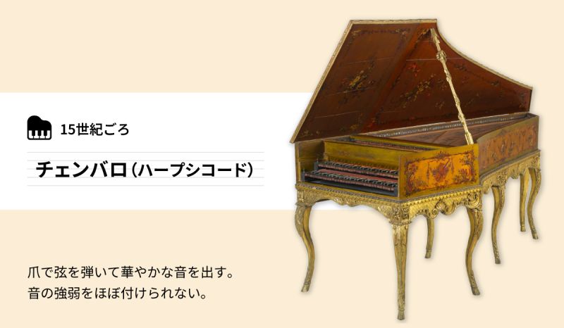 こうした音を鳴らす構造の共通性からピアノのルーツをたどっていくと、13~14世紀ごろに誕生したとされる「クラヴィコード」と、14~15世紀ごろに誕生したとされる「チェンバロ(ハープシコード)」という2つの鍵盤楽器に行き当たります。クラヴィコードは鍵盤を押すとタンジェントという真鍮製の棒が弦を打って音を出す仕組みで、繊細な音色が特長ですが音量が極めて小さく、楽器のそばにいないと聞こえづらいほどでした。一方、チェンバロは鍵盤を押すとジャックという細長い棒に取り付けられた爪が弦を弾いて音を出す仕組みで、音が華麗で音量もクラヴィコードより大きいものの、音の強弱や音色の変化をあまり得られないという短所がありました。これらの鍵盤楽器の短所を解消するとともに、より良い音を奏でるために開発されたのがピアノなのです。