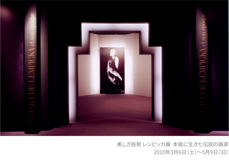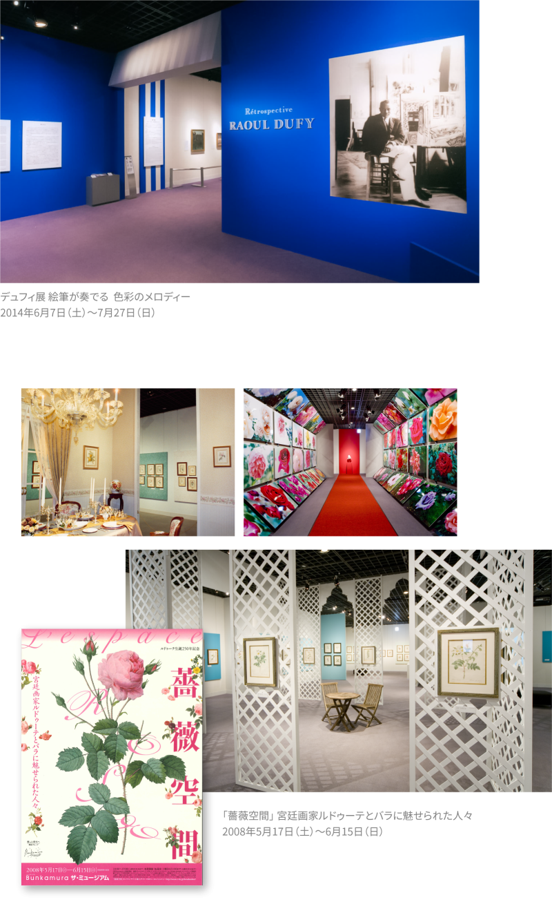 たとえば、ヴェネツィア絵画の黄金期をテーマにした『ヴェネツィア絵画のきらめき 栄光のルネサンスから華麗なる18世紀へ』(2007年)では、ピンクの壁紙やヴェネツィアン・グラスのシャンデリアなどを用い、作品が飾られていたであろうヴェネツィアの大邸宅をイメージ。ニースなど南仏の地でさまざまな題材を見出した画家デュフィの個展『デュフィ展 絵筆が奏でる 色彩のメロディー』(2014年)では、ニースを象徴する青と白のストライプを入口から会場全体にデザイン。「花のラファエロ」と称えられた植物画家ルドゥーテのバラ図譜を額装展示した『薔薇空間―宮廷画家ルドゥーテとバラに魅せられた人々』(2008年)では、会場内にパーゴラとガーデン用の椅子とテーブルを置いたりパフューマリー・ケミストの蓬田勝之によるバラの香りの演出なども加え、五感を刺激するバラ庭園のような空間を出現させました。
