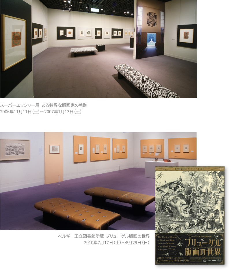 また、展示空間の統一感を損なわないアクセントとして、館内の休憩用ソファのカバーも展覧会ごとに模様替えしていたのをご存じでしょうか? たとえば、黒と白の色使いを特徴とするだまし絵の巨匠エッシャーの大規模展『スーパーエッシャー展』(2006年)ではシマウマ模様を、山岳絵画をテーマにした『スイス・スピリッツ 山に魅せられた画家たち』(2006年)ではスイスの高原をイメージして牛の柄(一般的な乳牛の白と黒ではなく、スイスの乳牛に特徴的な白と茶色のまだら模様を再現)を使用。カバーの布はザ・ミュージアムのスタッフが生地店からイメージに合ったものを探し出していましたが、『ベルギー王立図書館所蔵 ブリューゲル版画の世界』(2010年)ではこだわりのあまりオリジナル柄の布まで作りました。
