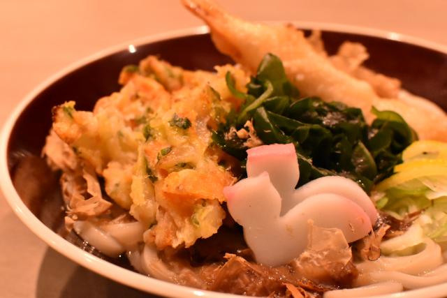白だしに柚子をきかせ、猫型のかまぼこにたっぷりのカツオ節など、具だくさんの体が温まるうどんです。