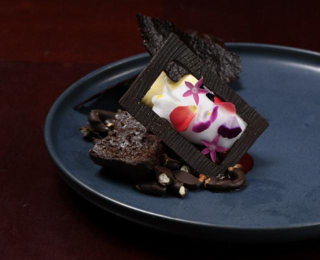 ワインの産地としても知られるリヒテンシュタイン侯国。ショコラをベースにワインを合わせ、絵画をイメージし華やかに仕上げたデセール。