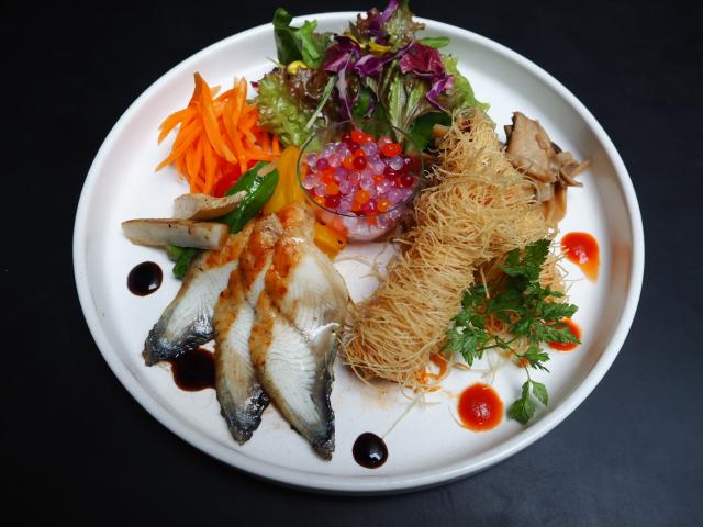 宝石箱の様な華麗なイメージそのままに、彩り豊かなテングサをあしらい、華やかなワンプレートに仕上げました。千切りしたパイ生地で巻いた海老の天ぷらのサクサクな食感をお楽しみください。