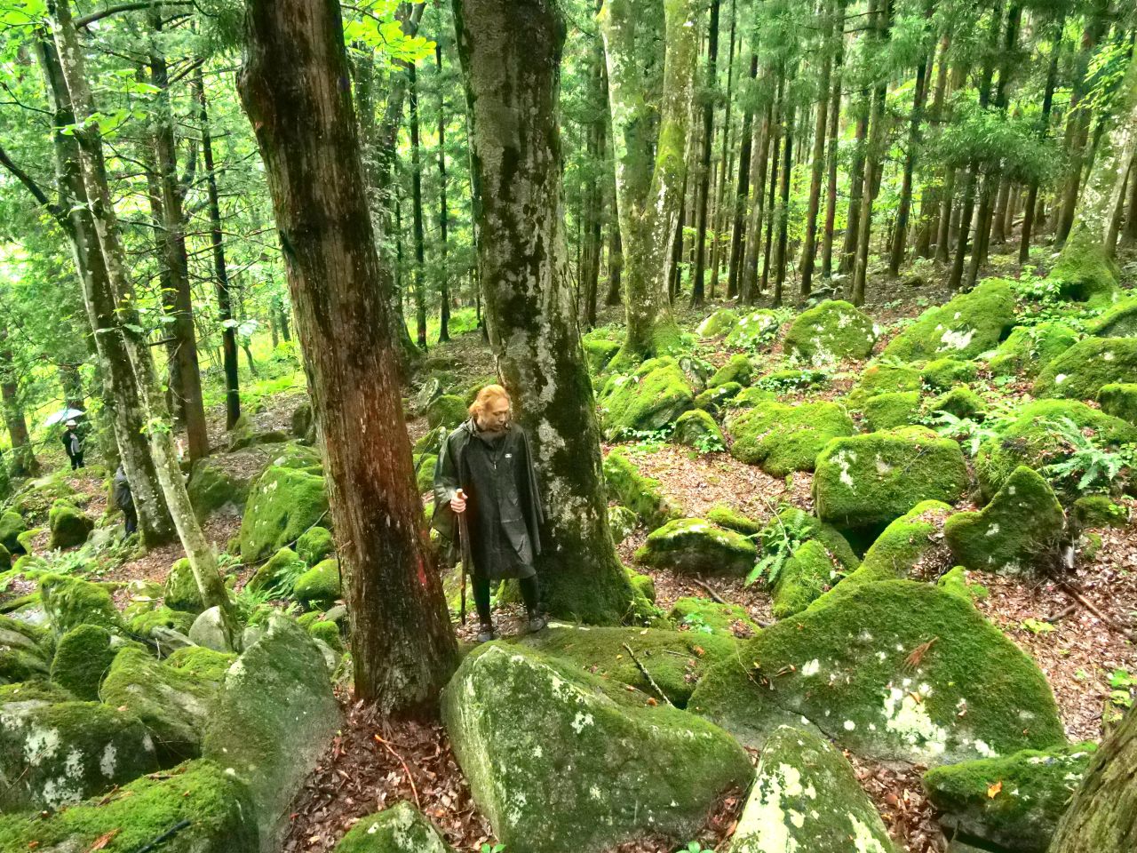 五百羅漢を訪ねた森山さん。苔むした森の中を進む