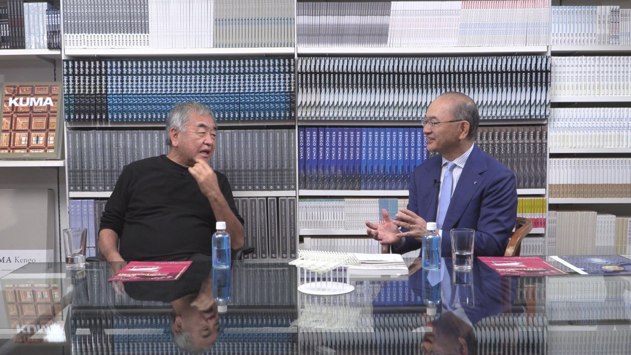 高砂熱学 Presents 鈴木優人&バッハ・コレギウム・ジャパン×隈 研吾《フィガロの結婚》(2026年2月19~23日、めぐろパーシモンホール 大ホール)について、美術を担当する隈 研吾氏(建築家)とスポンサーを務める高砂熱学工業株式会社の小島和人社長が和気藹々と語り合った(2026年1月14日、隈研吾建築都市設計事務所)。
