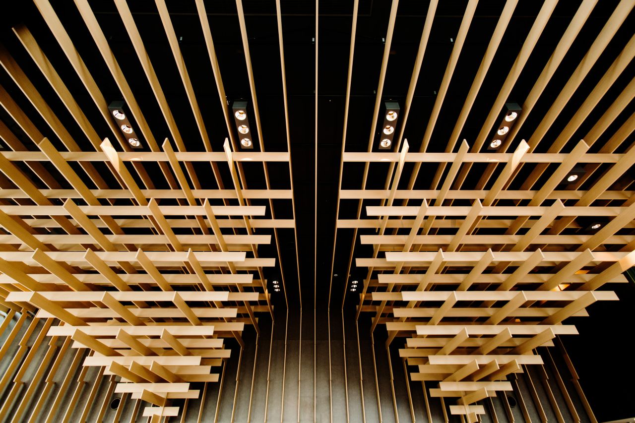 メインロビーの「斗栱(ときょう)」は、日本の伝統的な寺社建築の屋根を支える木組みの構造をモチーフとしたデザインです。