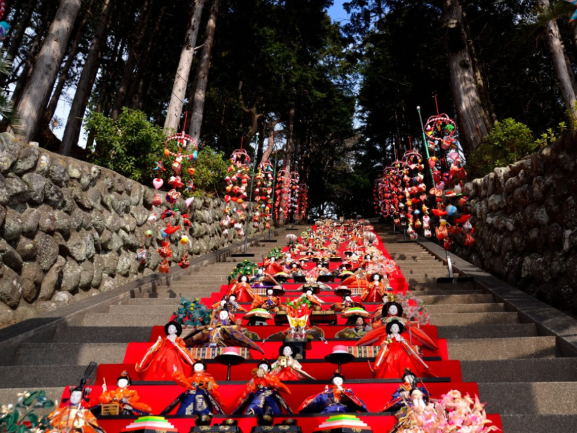 東伊豆町の素盞鳴(すさのお)神社の雛段飾りと雛のつるし飾りの様子(毎年2~3月開催)