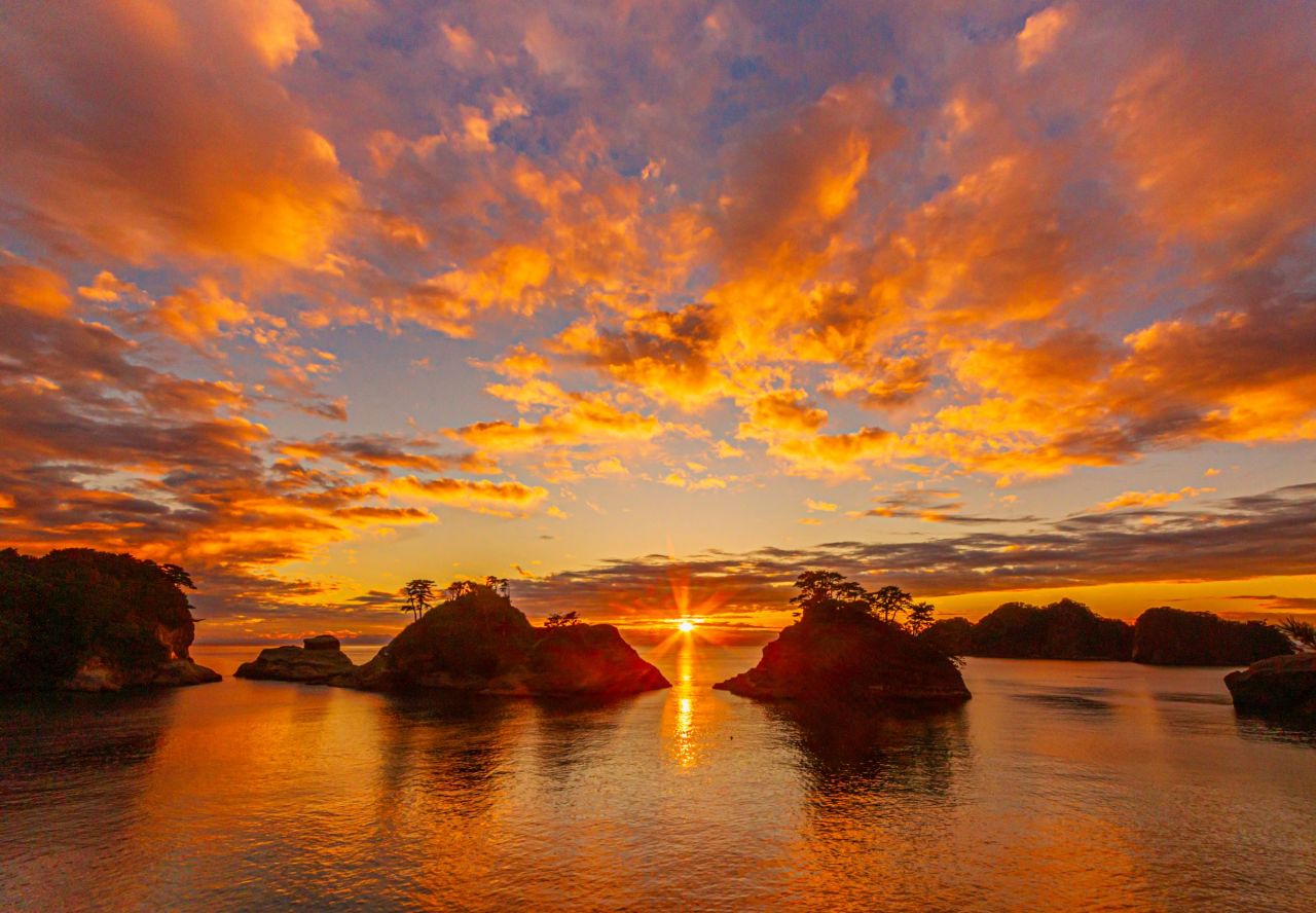 西伊豆の堂ヶ島は、海沿いの絶景が自慢。夕陽を眺めながら温泉に入ることができます!干物や海産加工品が特産で、港町ならではの暮らしや文化が息づいています。