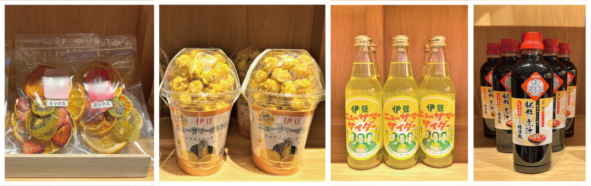 左から「こらってぃ ドライフルーツ」「ふたつぼり ニューサマーポップコーン」「ふたつぼり 伊豆ニューサマーサイダー」「徳造丸 秘伝の煮汁 醤油味」