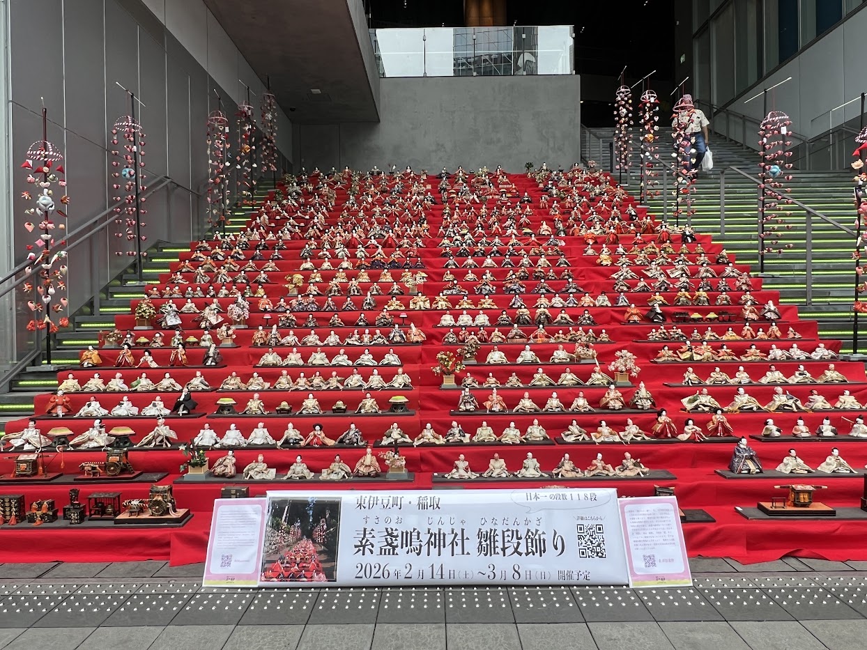 訪れた人々の注目を集めたのが、毎年2月から3月にかけて開催される東伊豆町・稲取の「素盞鳴神社 雛段飾り」の再現展示。会場の大階段に飾られた雛飾りはまさに圧巻で、「実際に現地で見てみたい!」との声も。海外からの観光客の方々も興味津々でカメラに収めていました。