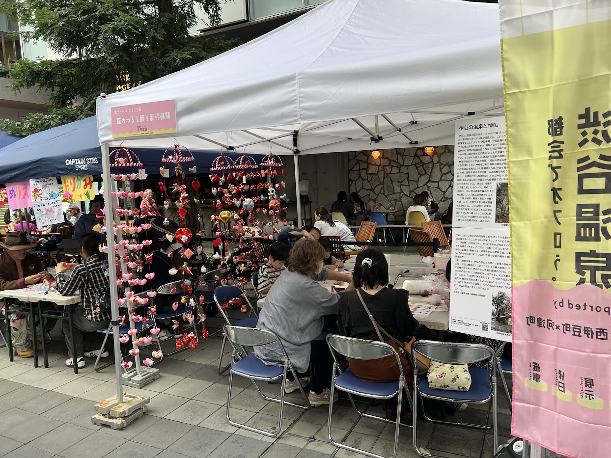東伊豆町は伝統工芸「雛のつるし飾り」発祥の地。会場では「雛のつるし飾り」の保存と継承に携わる団体・ニコニコ会から講師がやってきて、ワークショップも開催されました。小さな布を縫い合わせて、ひとつの雛飾りを作ります。できあがった自分の作品を手に、参加した方々も嬉しそうな表情を浮かべていました。