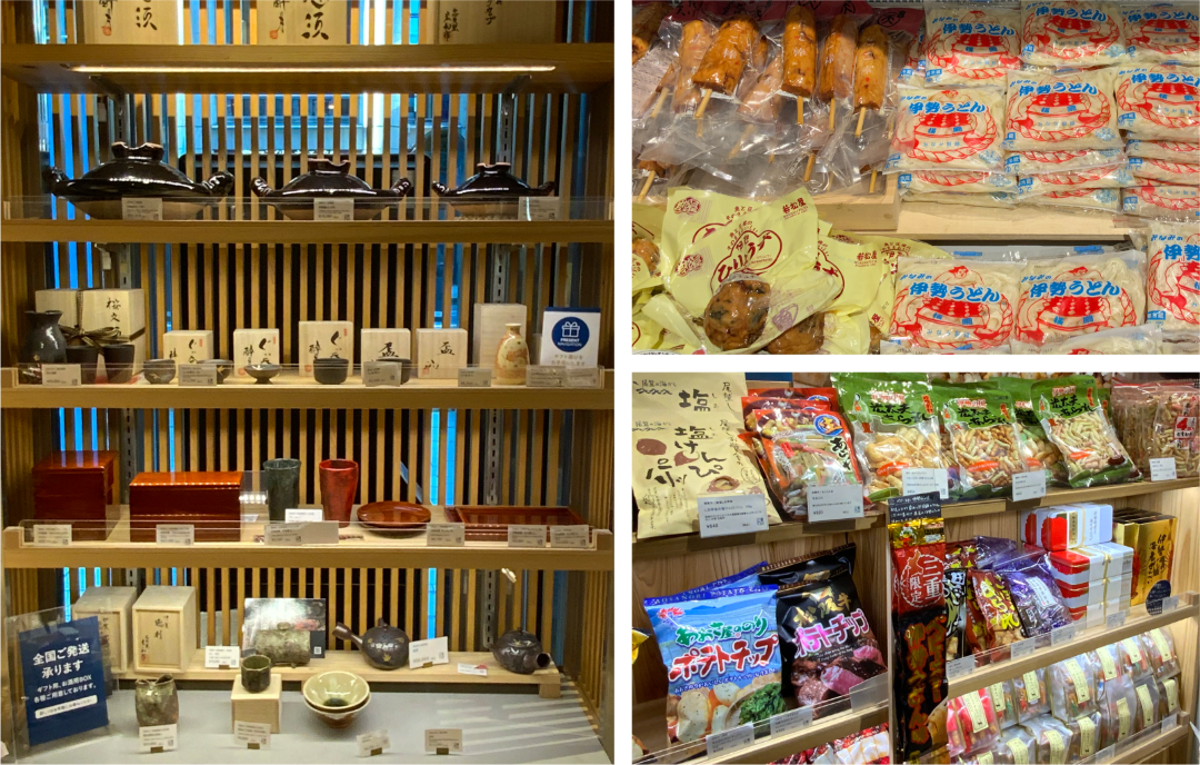 さらに店内を進むと、鳥羽のご当地銘菓「シェル・レーヌ」をはじめ、松阪牛を使ったビーフシチューなどのレトルト食品、伊勢うどんといった地元に愛されるソウルフード、地域の風土に育まれた地酒、伊賀焼などの伝統工芸品がずらり。店内を巡るだけで、三重の暮らしや文化に触れているような気分になります。