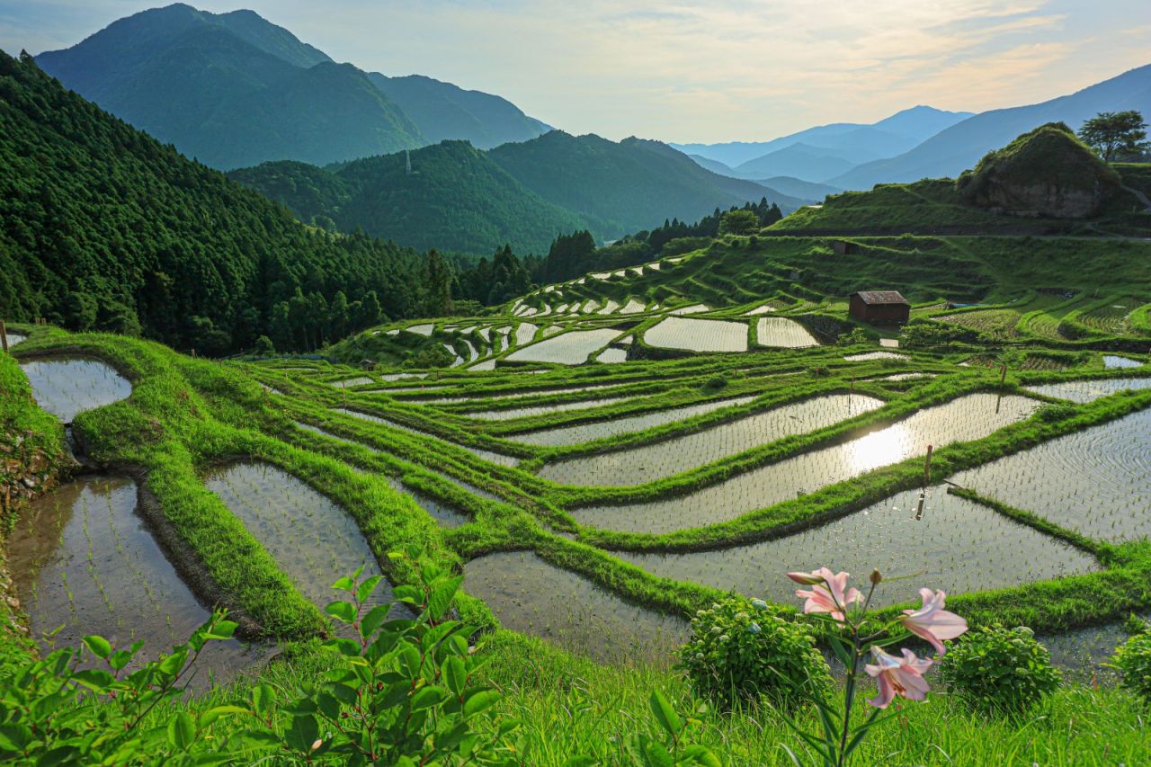 田植えを終えたばかりの丸山千枚田(熊野市)。約1,300枚の棚田が段々に連なり、日本最大級ともいわれる景観が山あいを彩ります。水面に映る空と緑のコントラストは、日本の原風景を思わせる美しさです。