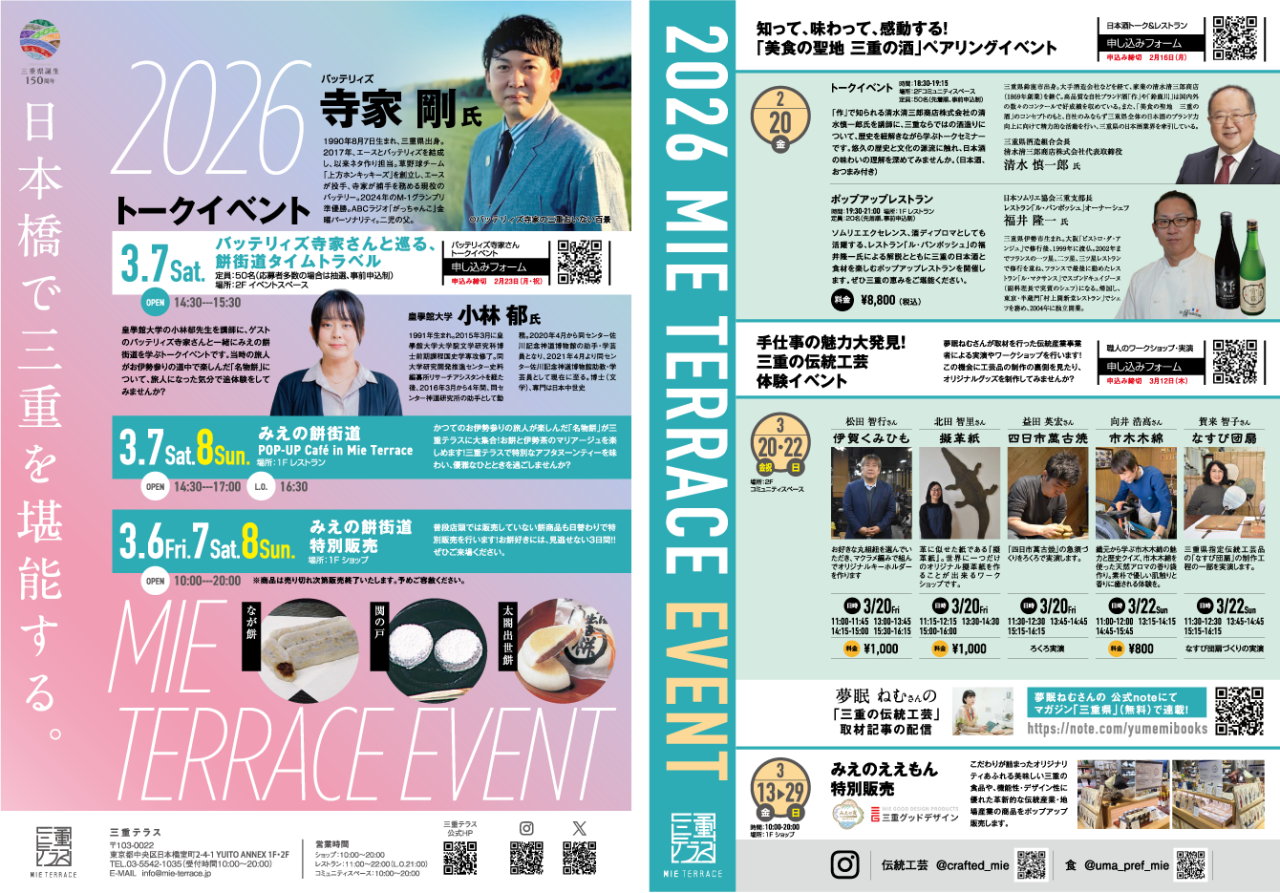 2026年は三重県誕生150周年。三重テラスでも周年事業として、食や伝統産業の魅力を伝えるイベントが2月から3月にかけて開催される予定です。伊賀くみひもや市木木綿など三重の伝統工芸職人による実演・ワークショップ、日本酒と三重県産食材のペアリングをテーマにしたポップアップレストラン、津市出身のお笑い芸人・バッテリィズ寺家さんと餅街道について学べる講座など、多彩な企画が盛りだくさん! 三重の文化に親しむ入口として、気軽に参加できる機会となっています。