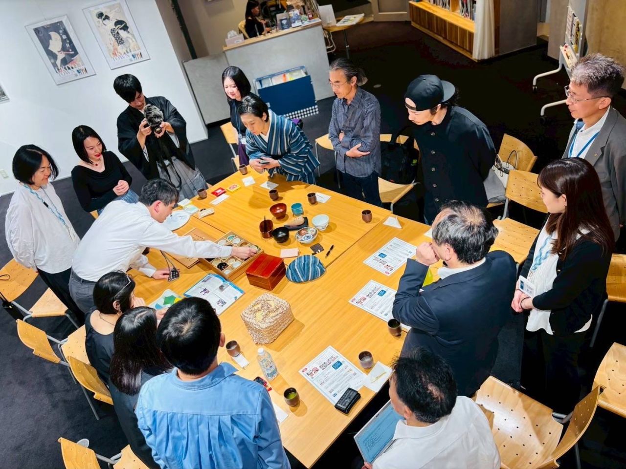 2階のコミュニティスペースで開かれている「三重テラス部活動」。写真は伝統工芸部の活動の様子。持ち寄った工芸品を囲みながら、その魅力や背景について語り合います。ほかにもビール部や湯道部など、テーマはさまざま。