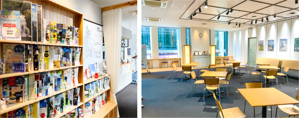 左)旅のプランニングにうれしい、三重県内の観光パンフレットがずらり。気になることはコンシェルジュに相談できるのも心強いです。