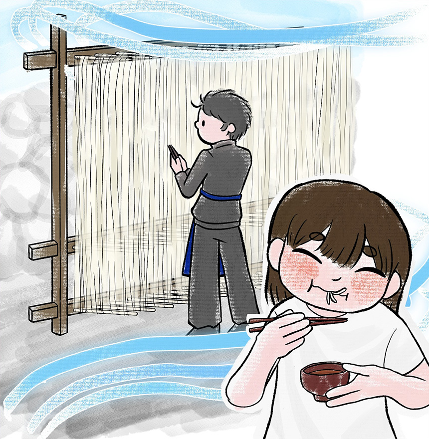 徳島県出身の父の影響で、夏に何気なく食べていた徳島県の特産品「半田そうめん」を描きました。徳島にはそうめん作りに最適な四国山脈から吹き降ろす冷たい風や吉野川の澄んだ水など風土や気候が揃っており、生産が盛んになったと言われています。