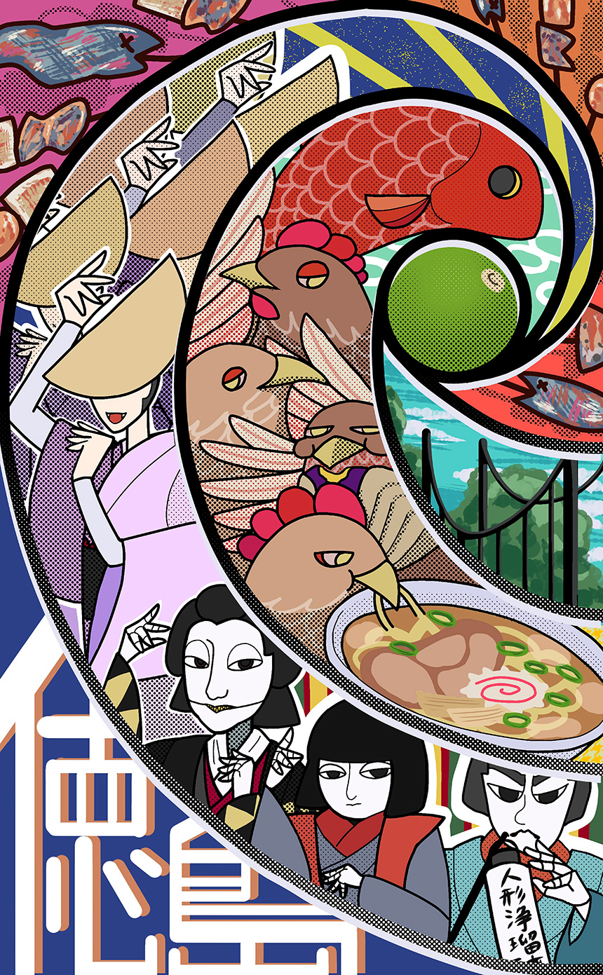 鳴門の渦潮でコマ割りをし、その中に徳島の有名品を描きました。一番外側のでこまわしを渦に沿って描いて流れを意識しています。背景の暖色系は焼かれてるイメージで。徳島の文字は藍染らしく、文字を強調するために反対色のくすみ橙を影にしました。阿波踊りの枠には、人間だけでなく人形浄瑠璃の人形達も一緒に踊っています。渦の中心近くの黄色い線は祭りの光を表しております。阿波尾鶏達の枠は食べ物です。ラーメンを啄む鳥、なると金時を食べる鳥、阿波踊りを踊る鳥がいます。鳴門鯛が渦の中心に向かうようにしています。橋の枠は、淡路と徳島を繋ぐ橋でどちら側にも見えるようにしました。徳島側から見た淡路なのか、淡路側から徳島に向かうところなのかは見た人の想像に任せています。渦の中心には酢橘を置きました。日本一の酢橘、と言うことです。