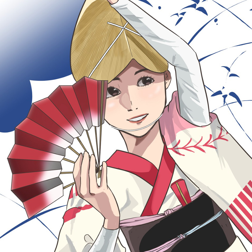 このデザイナーが描く「阿波踊り」の世界観が僕のイメージに一番近いです。愛染扇子を持つ踊り子さんの優雅さ、良いですね。阿波踊りマンガの主人公になりそうですね。素晴らしいマンガデザインです。