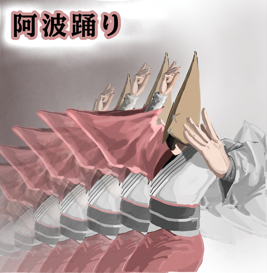 阿波踊り4連続の最後は、イリュージョンです。まるで動画を見ているような美しい再現力、「踊る阿呆に見る阿呆、同じ阿呆なら踊らにゃ損々」の掛け声が聞こえてくる動きのあるマンガデザインモーションのような秀作です。