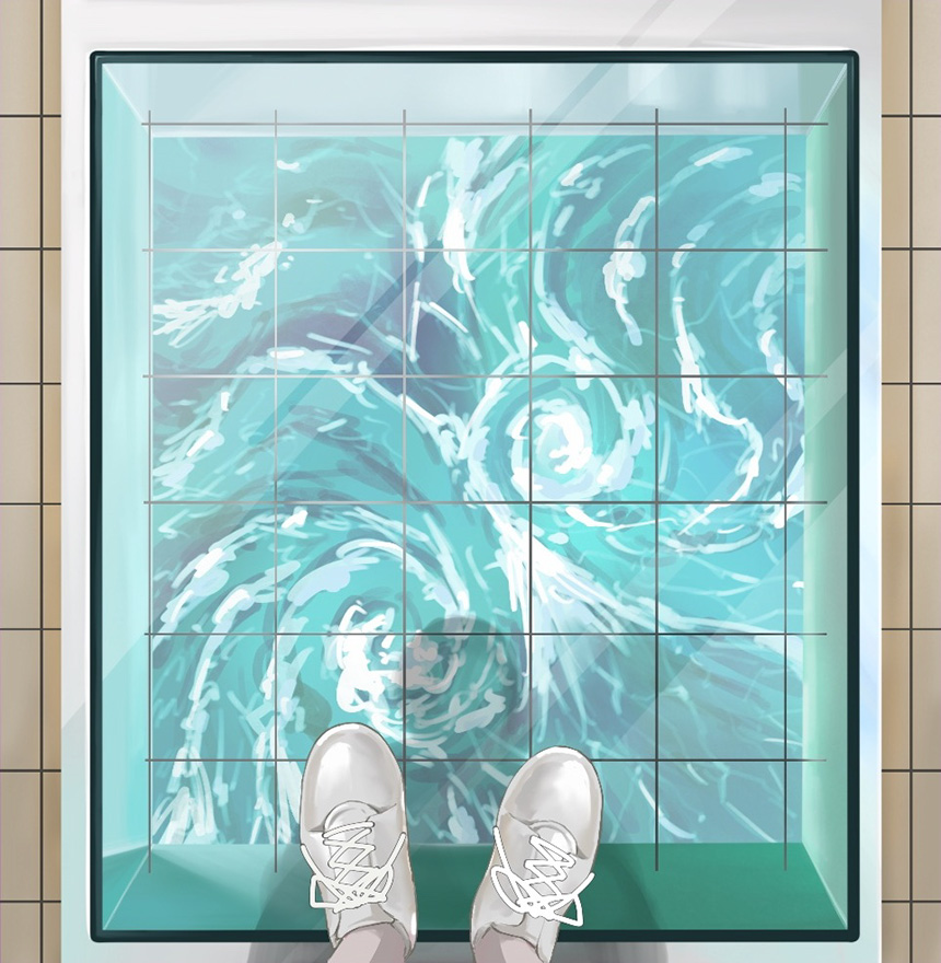 鳴門大橋の下にある「渦の道」から着想を得た作品。透明なガラス越しに見る渦潮は、まるで足元に渦が広がっているかのように感じられ、その迫力に心を打たれる。