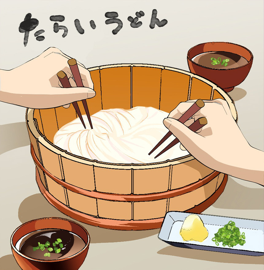 たらいうどんは、徳島県の郷土料理で、大きなたらいに茹でたうどんを入れみんなで囲んでつけ汁につけて食べるスタイルが特徴です。地域のあたたかい人のつながりや家庭的な雰囲気を表現したいと思い、本作品を制作しました。