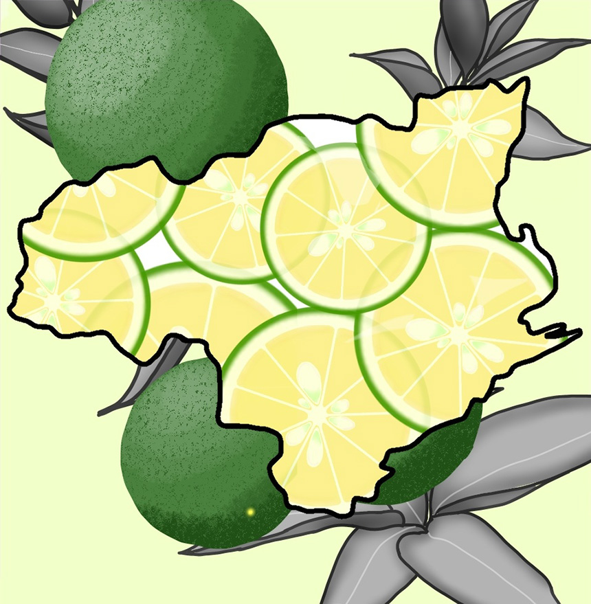 徳島県の特産のすだちを描きました。徳島県の形の内側には薄く輪切りにしたすだち、外側には収穫前のすだちを描きました。