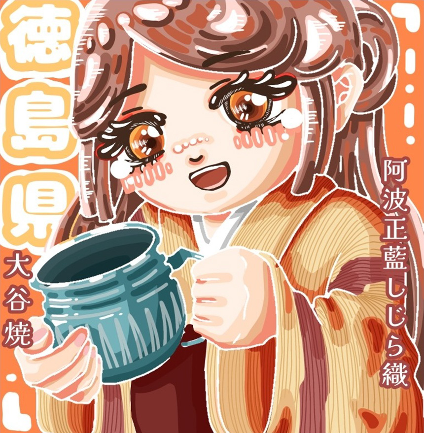 徳島県の文化芸術を2点組み合わせた素晴らしい作品です。230年の歴史の大谷焼きと凹凸が特徴の阿波生藍しじら織を若い被写体を使って表現したマンガデザインは完璧ですね。目の輝きが商品の良さを表していますね。