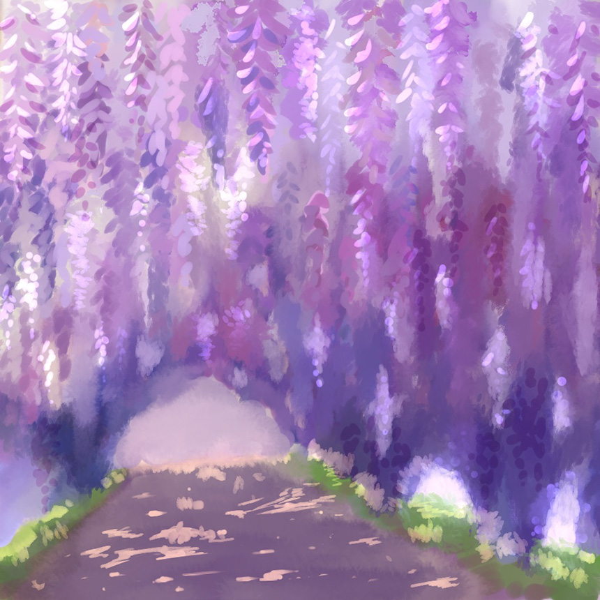 まだ直接見ることができていない見たい花のひとつが「藤」なので選びました。藤の色鮮やかさと日の光の反射を意識して描きました。