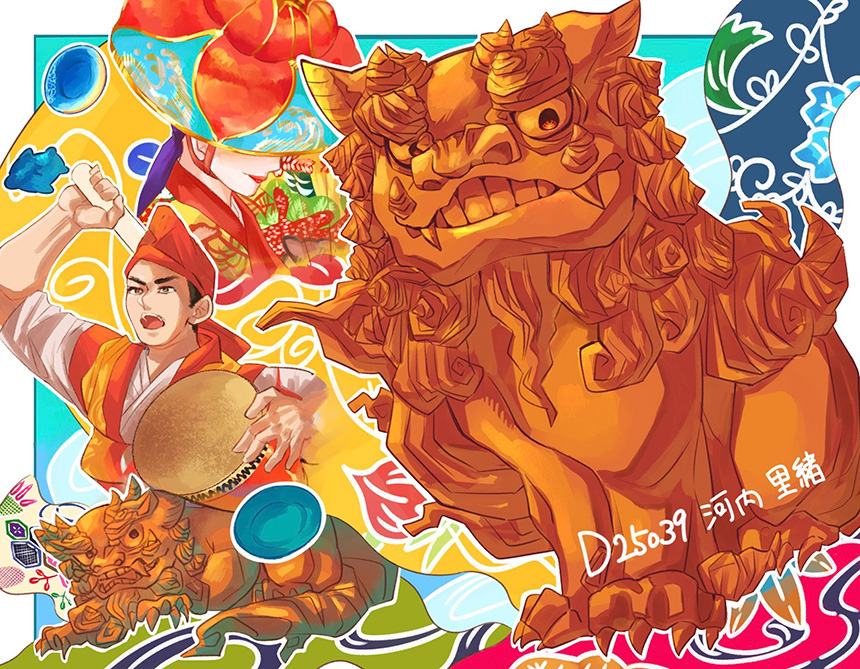力強くかつ繊細な素晴らしいマンガデザインです。動きのある踊りと合わせることで、本来動かないシーサーが動き出しそうな勢いを感じます。色彩も美しく、このデザイン力、将来が楽しみですね。