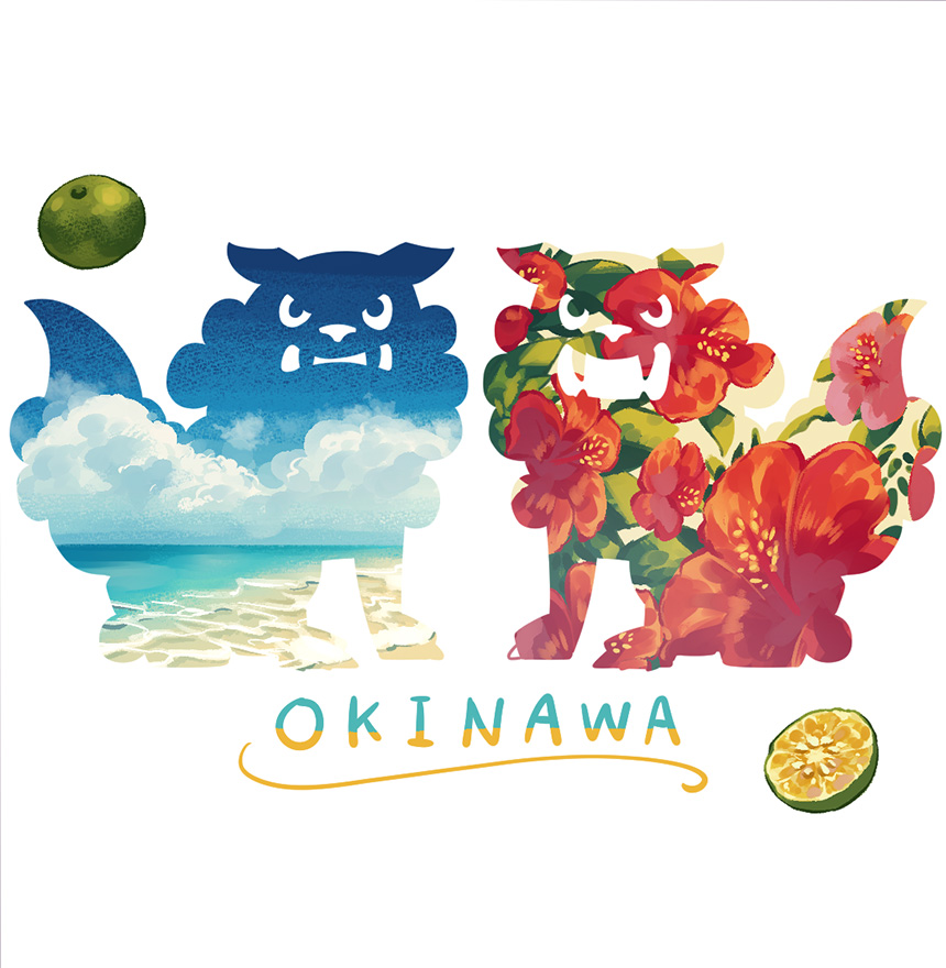 以前、平和をテーマに沖縄を描いたとき、沖縄の美しさをもっと出せたらよかったなと思ったため、シーサーのシルエットの中に、美しい沖縄の背景、ハイビスカスを描きました。沖縄らしさと、美しいと思える風景画を上手く合わせられるように描きました。