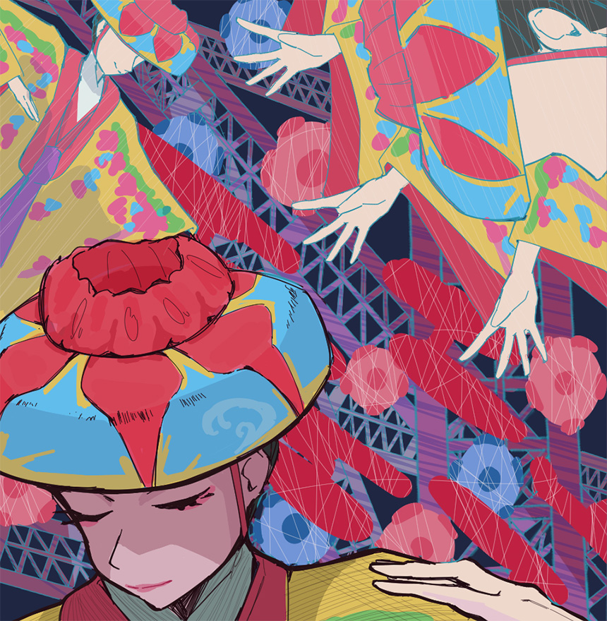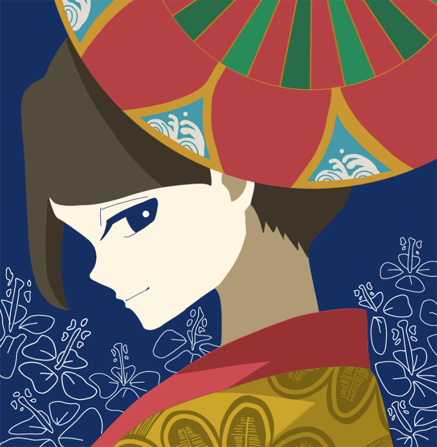 制作意図にも書かれているように、人、背景、花笠のデザインを引き立たせるために、あえて平面的に描き、色彩で浮き立たせていますね。文化芸術を描く手法としては素晴らしいです。マンガデザインがぴったりです。
