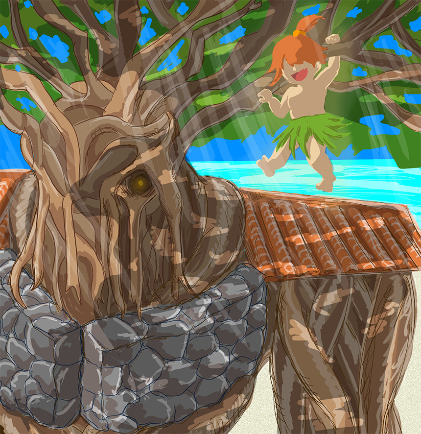 かわいいガジュマルのキャラを描こうと沖縄のガジュマルの画像を検索したところ、想像以上に力強い姿をしていたので、強そうな方向に舵を切りました。石垣などの人工物を巻き込んで成長している姿のものが印象的だったので、沖縄の特徴的な建造物の要素と合わせてゴーレムやロボットのようなキャラクターにしました。また、それ単体だと物騒になるので、ガジュマルに宿ると言われるキジムナーを可愛く添えることで、攻撃的な存在ではなく、守ってくれる者のような印象を演出しました。