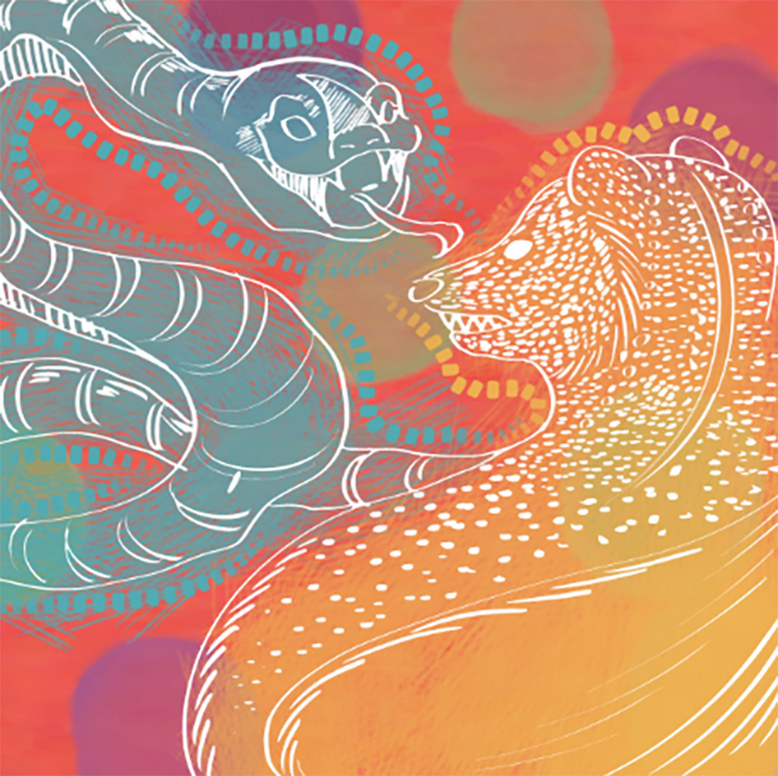 「ハブ対マングース」という直接闘わせる決闘ショーは、実際に沖縄で行われていました。まさにこのマンガデザインのように睨み合っていたのでしょう。ただ、このショーは動物愛護の観点から20年以上前になくなりました。 歴史を残す、マンガデザインの役割ですね。