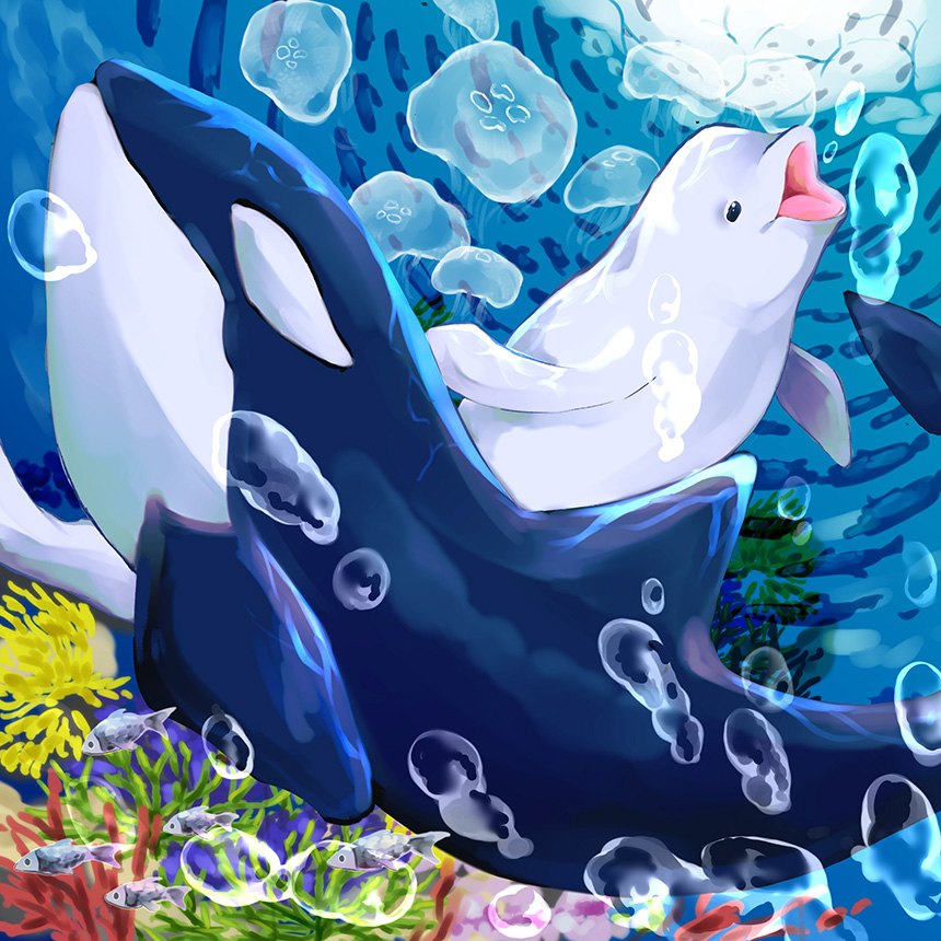 名古屋港水族館で有名なシャチとベルーガをメインに、青だけでなく少しカラフルになるように珊瑚礁などを加え、その他クラゲや泡などの透明感を出せるように頑張りました。