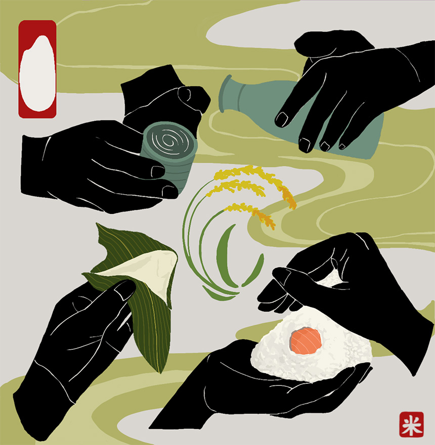 お米作りには多くの人の手が関わっています。田植えや収穫の手、加工や調理の手、そしてそれを届け、受け取る人の手。そんな手から手へと受け継がれる想いを「いただく」という瞬間に焦点を当てて表現しました。