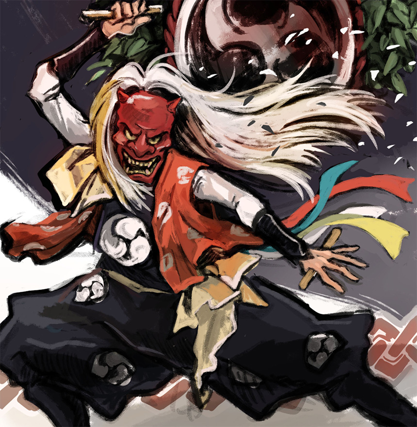 佐渡の伝統芸能「鬼太鼓」を迫力せまる動き、鬼気溢れる表情、色彩、言うこと無しです。制作意図もしっかり書かれていて、先に読んでデザインを見るとその内容が細部まで描かれていることがよくわかります。いい作品です。